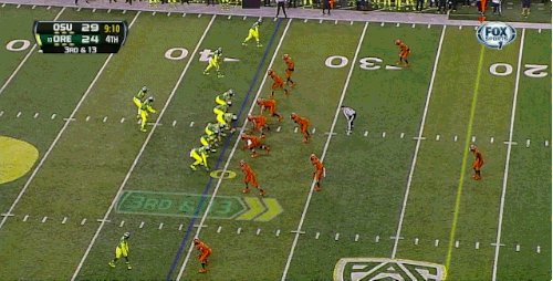 Mariota egy nyitott, fast-tempo offense-ben érte el a sikereit, ezért is volt olyan értékes Chip Kellynek. Nagyon érezte a zone-read optiont, rendkívül gyorsan reagálta le a körülötte kialakult szituációkat, ha kellett passzolt, futott, vagy ahogy az alábbi gifen látjuk, megszabadult a labdától: