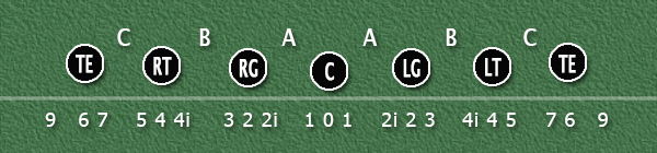 Kezdjük kicsit távolról, az alapoktól, de ígérem, rövid leszek. A támadófalban vagy azon kívül megnyíló réseket lyukaknak, “gap”-eknek nevezzük, ebből minimum 6 darabot találunk a pályán, de ha tight endek vagy extra támadófalemberek is a formáció részei, akkor akár 8 is lehet belőlük. Erről volt már szó a 3-4 vs 4-3 védelmek cikkünkben is, de érdemes lehet feleleveníteni az alábbi ábrával.