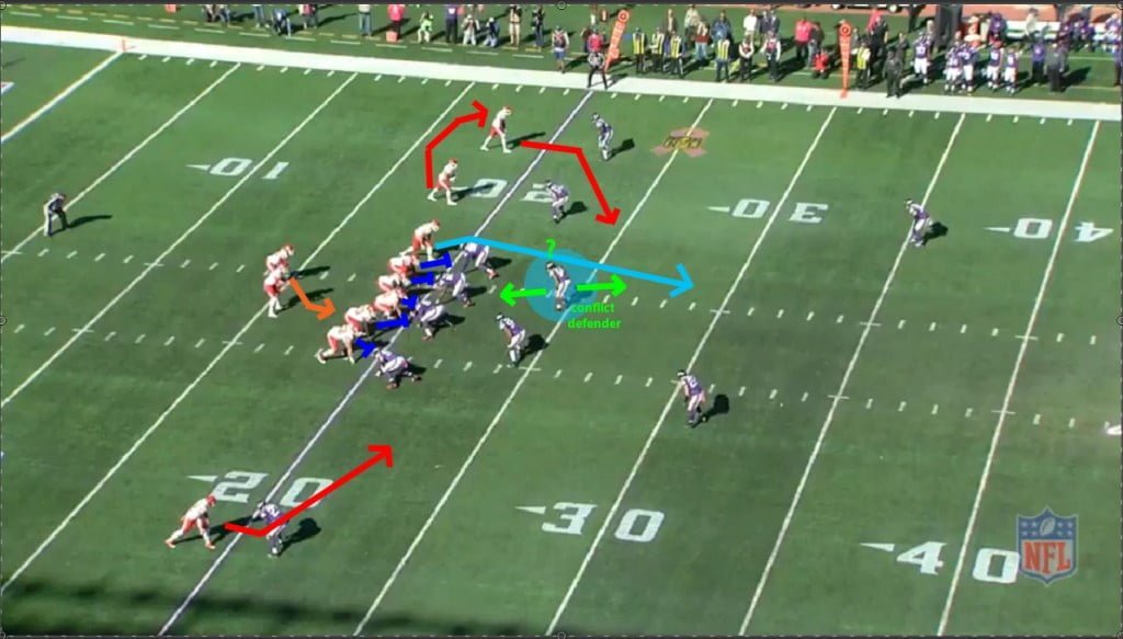 A támadófal futáshoz blokkol, mindeközben az elkapók útvonalakat futnak. Két slantet is láthatunk, de nem ezek a fontosak, hanem a seam route Kelcetől és a bubble screen a slot elkapótól. A Vikings védelmében Eric Kendrickst pécézték ki, ő a “conflict defender”, akinek a mozgásától függ, mi lesz a játék. Ha a helyén marad, akkor mehet a futás, viszont ha felmozog, akkor elsődleges opciónak Kelce seam route-ja a megoldás, ha esetleg valami oknál fogva ő sem lenne megjátszható (slot corner vagy safety oda mozog), akkor mehet a bubble screen.