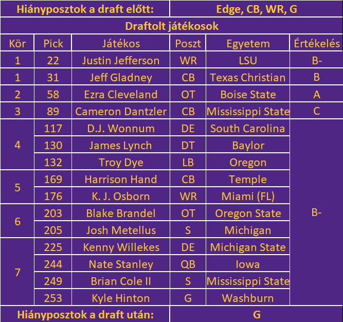 A Vikings a 2020-as offseasonban egy átépítési folyamatba kezdett bele. Pár meghatározó, de idősödő játékos elküldése és a 15 választás mindenképp ezt sugallja. Egyes szakértők a draft egyik legnagyobb nyertesének tartják a Minnesotát. Tény, hogy a sok választással sikerült pár ígéretes tehetséget szerezniük, és a nagyobb merítési lehetőségből kis szerencsével több játékos fog karriert befutni a profik között. Mindezek ellenére én kicsit úgy érzem, hogy a mennyiség miatt lett egyeseknek ez egy kicsit túlságosan is felértékelve. Egyáltalán nem gondolom, hogy rossz drafton lenne túl a Vikings, de a legmagasabb polc nálam picit túlzó. Az első három választott akár rögtön kezdő is lehet a csapatban (Reiff – Cleveland párharcon múlik), ami önmagában már jó előjel. A hátsó körökben való rengeteg lehetőségből azonban talán kicsit többet is ki lehetett volna hozni. Jó pár esetben választottak hasonló stílusú játékost, vagy olyan embert, aki kicsit meglepő volt a draft azon pontján. A sok távozó, sok új ember miatt némi visszaesést várok a csapattól, de ha ebből a 15 újoncból 5 meghatározó játékos és pár hasznos csere lesz 2022-re, akkor Minnesotában sikeresen tették le az alapot a hosszútávú projektnek.
