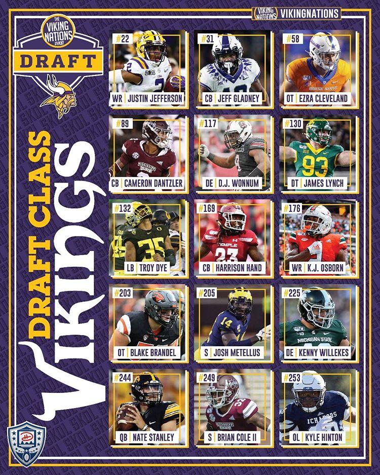 A Vikings elsősorban cserék útján gyűjtötte be ezt a gyakorlatilag két draftra is elegendő mennyiséget. Noha a top100-ba “csak” négy választásuk esett, abból kettő is az első körben. A temérdek pick a harmadik napra gyülemlett igazán fel, ahol is 11 játékost választhattak.
