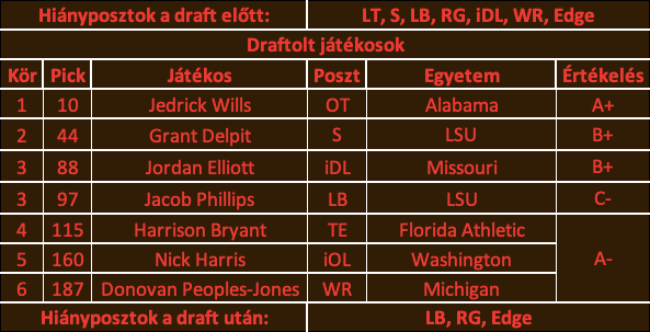 Összességében nagyon jól draftolt a Browns, jó értéken érkeztek tehetséges játékosok hiányposztokra, így sok ok nem lehet a panaszra, egyedül a Phillips pick nem tetszett.