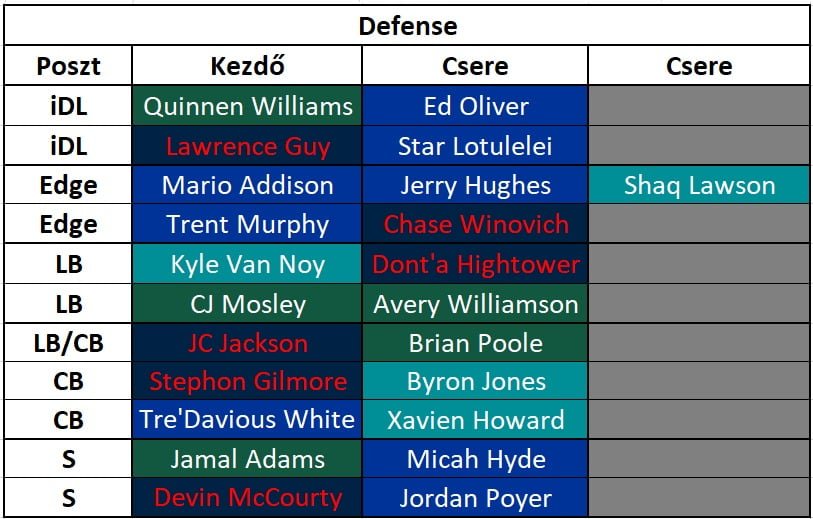 Cserék: Avery Williamson (NYJ), Dont’a Hightower (NE),