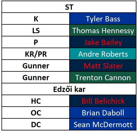Mivel elkapóból/futóból így is nehéz volt összeszedni a minimum mennyiséget, a back7-ből pedig pláne nem kockáztatnám senki egészségét, így inkább külön ST-ászokra lőttem el a maradék roster-helyet. Így került a csapatba Matt Slater, aki tavaly ismét remekül játszott, mellé pedig gunnernek Trenton Cannont szánom, míg a visszahordó a veterán Andre Roberts lenne, aki tavaly 26,6 yardot átlagolt kickoff visszahordásonként.