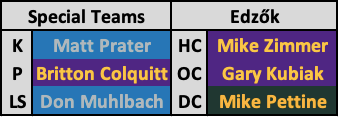 Kicker poszton Mason Crosby jöhetett még szóba, de az utóbbi öt évet nézve Prater jobban dolgozott, így ő lett a kezdőm, ráadásul ő már össze is van szokva a nálam okosabbak által a csoport legjobb long snapperének gondolt Don Mulbachhal. Punternek pedig a Vikingsból választottam magamnak játékost Colquitt személyében.