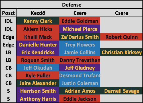 A CB-sor nem a legfényesebb, sokat elmond, hogy egy újonc számítana az elsőszámú corneremnek – még ha Okudah tényleg óriási tehetség is. Fuller is bérelt magának egy helyet a kezdőben, a slotba pedig Jaire Alexandert szánom, aki ugyan nagyobb részt szélen játszott a Packersben, skill setje alapján jól muzsikálhat belül is. Az ő cseréje lesz Justin Coleman, akit két éve elit slot cornerként kezeltünk, de tavaly a Lionsbe igazolva nem hozta azt a szintet – most reméljük, visszatér korábbi formájához, mert más jó slot CB-t nem igazán találunk a divízióban. A szélen pedig egyrészt a veterán Desmond Trufant kap helyet csereként, illetve az újonc Jeff Gladney-nek szavazok bizalmat.