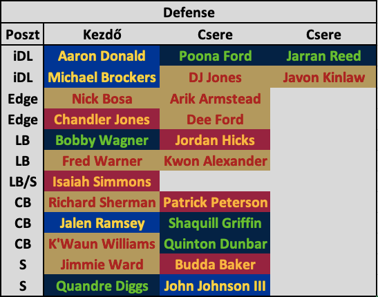 A padra felfért két Seahawks- és két 49ers-játékos, Kinlaw ráadásul újoncként, mert ha kijön belőle a potenciálja, akkor simán ki is szoríthatja Brockerst az év közepére. DJ Jones, Poona Ford és Jarran Reed adják még itt a mélységet, mindannyian korrekt, de nem kiemelkedő játékosok. Egyébként Arik Armsteadet a pass rusherek közül be lehet mozgatni passzszituációkban középre, ami minőségbeli pluszt hozna ilyen helyzetekben.