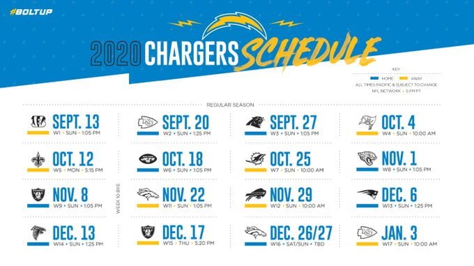 A csoport legkönnyebb sorsolása egyértelműen a Chargersé, és bár a verhető ellenfelek többnyire szétszórodtak a 17 hétben, egy jó periódus azért összejött. A Jets-Dolphins-Jaguars-Raiders sor nem tűnik megugorhatatlannak első ránézésre, utána pedig egy bye weekkel a zsebben utazhatnak Coloradóba a Broncoshoz.