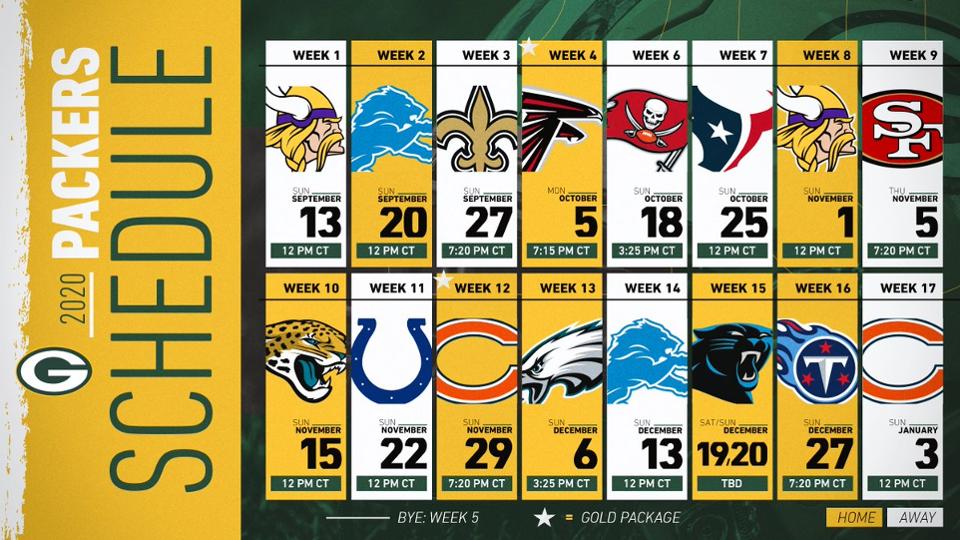 - 2020-ra öt főműsoridős meccsre készülhet a wisconsini csapat, ezekből kettő lesz hazai (Falcons, Bears), három pedig idegenbeli (Saints, 49ers, Titans).