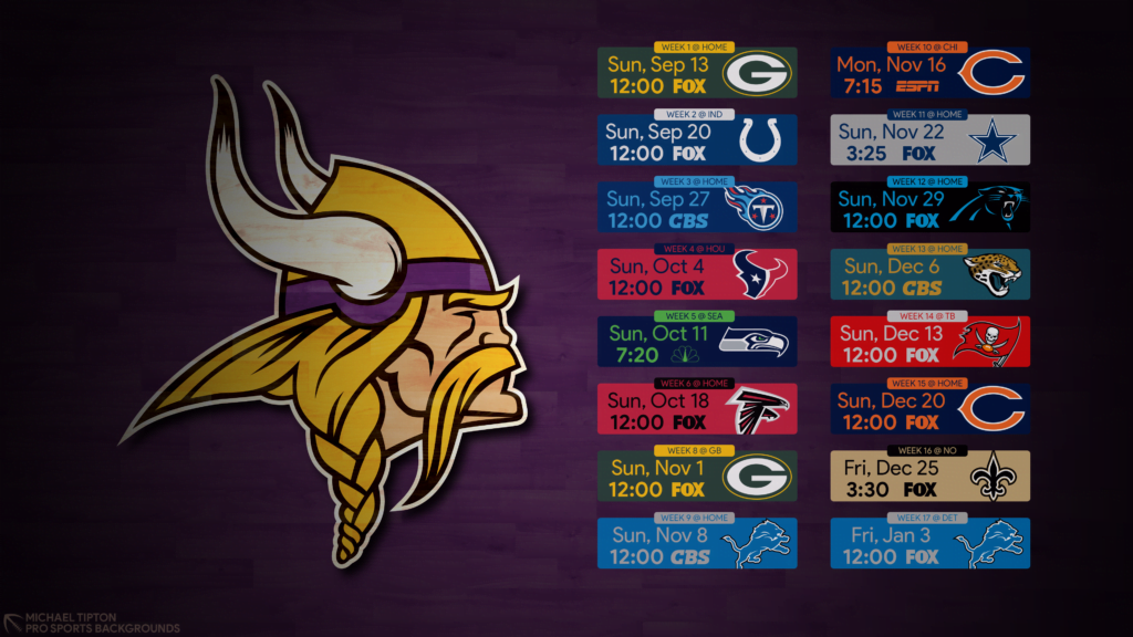 - A Vikings a hetedik héten megy pihenőre, a bye week előtt pedig letudnak egyhuzamban három non-konf meccset (2-4. hét között), majd a bye után után egyből jön egy csoporton belüli hármas rangadó (8-10. hét között). Ebből a három összecsapásból kettő idegenben lesz, előbb Green Bayben, majd Chicagóban.