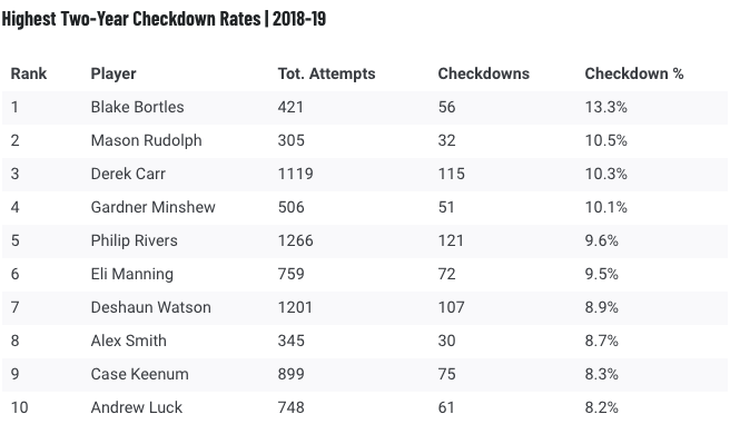A 10 legmagasabb checkdown-rátával rendelkező irányító rangsorát Blake Bortles vezeti, majd jön Mason Rudolph, az első jelenleg is kezdőnek számító QB pedig Derek Carr, aki elég sokszor tőlünk is megkapja ezt a derogáló jelzőt, az adatok szerint nem is alaptalanul. Ráadásul átlagosan 2,6 másodperc alatt dobja ezeket a checkdownokat, míg például Minshew 2,93 másodperc alatt. Minshew-nál csak Watson átlagos ideje volt hosszabb, ez pedig jót jelent a fiatal irányítóknak, hiszen ez azt mutatja, hogy inkább csak utolsó mentsvárként használják ezt az opciót. Watson neve furcsa lehet a listán, azonban azt is hozzá kell tenni az előző adat mellett, hogy neki van az egyik legjobb “Big Time Throw” aránya, tehát ő a chekdownok mellett nagyon jó arányban dob parádés passzokat is.