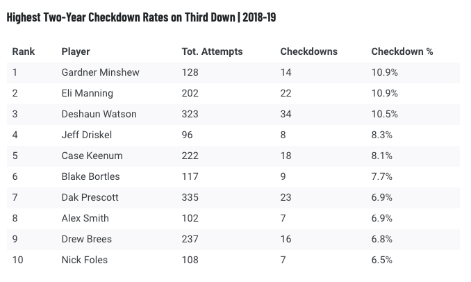 Innen eltűnt Derek Carr, így Garnder Minshew, Eli Manning és Deshaun Watson is feljebb mozgott a listán, ők hárman érik el a 10%-os határt. Watsonnál itt is ki kell emelni, hogy ugyan mindenkinél legalább 11-gyel több checkdownt dobott, ezeket átlagosan 3,15 másodperc alatt hajtotta végre, ami NFL-szinten egy örökkévalóságnak tekinthető. Dak Prescottot és Drew Breest lehet még kiemelni a jobbnak számító irányítók közül a listán, Brees ráadásul nagyon gyorsan is szabadult ilyen helyzetekben a labdától (csak Foles dobott gyorsabban checkdownt) és Brees számított a legkevésbé agresszív játékosnak ilyen helyzetekben, 43,4%-ban nem dobta el a labdát a first downt jelző vonalig, ami a legmagasabb arány volt az egész ligában.