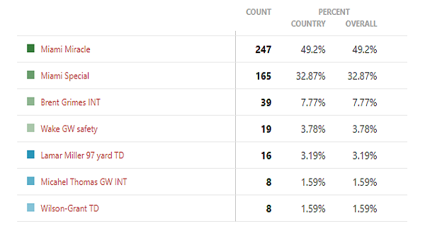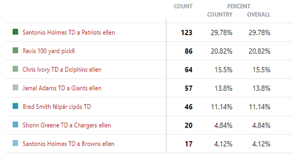Kétesélyes volt ez a meccs, és abból a szempontból nem is történt nagy meglepetés, hogy a két Super Bowl play került az első két helyre. Ami talán meglepőbb, hogy nem az esélyesebbnek gondolt Butler INT nyert, hanem Edelman elkapása. Ráadásul nem is kicsit nyert, majdnem kétszer annyi szavazatot szedett be mint a Butler INT. A harmadik helyre még az Edelman-Amendola TD fért fel.