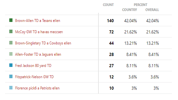 Jarred: A Billsnél nem nagyon volt egyértelmű favoritom, viszont a havas meccseket mindig is szerettem, így McCoy nálam nagy előnyről indított, és igazán nem is volt semmi más, ami be tudta volna előzni. Szép a Brown-Allen TD, de nálam kicsit elrontja az összképet, hogy kb ez volt az egyetlen értelmes játéka a Billsnek azon a meccsen.