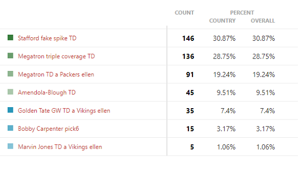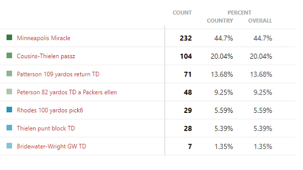 Ha volt csapat, ahol 1000%-ig biztosak voltunk, mi fog nyerni, akkor az a Vikings volt. A Minneapolis Miracle olyan pillanat volt, amit soha nem fognak a Vikings szurkolók elfelejteni, teljesen egyértelmű volt, hogy simán megnyeri ezt a szavazást. Az igazi kérdés inkább az volt, mi fog a második helyen végezni. Ez végül Cousins Thilennek adott passza lett, ami a szavazatok 20%-át kapta meg. A harmadik helyre pedig Patterson 109 yardos return TD-je fért fel.