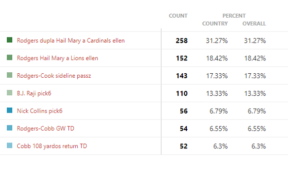 A Packersnél nem nagyon volt favoritunk erre a játékra, 7 playből 6-nál is el tudtuk képzelni, hogy a végén ez lesz a nyertes. Végül mondhatni nagy fölénnyel (100 szavazattal) Rodgers Cardinals elleni dupla Hail Maryje lett a befutó. A második helyre a másik Hail Mary ért be, míg a bronzérmet a Cowboys elleni sideline passz kapta.