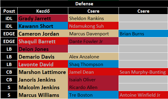 Cserék: Dante Fowler Jr., Marcus Davenport, Brian Burns