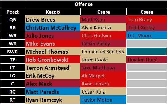 Egy szóval: brutális. A liga talán legjobb és legsokoldalúbban használható futója és a cseresorban is egy szintén top5-ös játékos. Mögöttük pedig az a Gurley, akit két éve még a berobbanó McVay-rendszerben a liga legjobbjának tartottak sokan. A sor bár elképesztő nevekből áll, még mindig nem a legerősebb egysége a csoportnak. McCaffrey-t lehet, hogy hamis slot receivernek is lehetne használni, hisz akkor az ő erényei mellett Kamara is pályára tudna kerülni, de kérdés melyik elkapótól vennének ők el snap számot…
