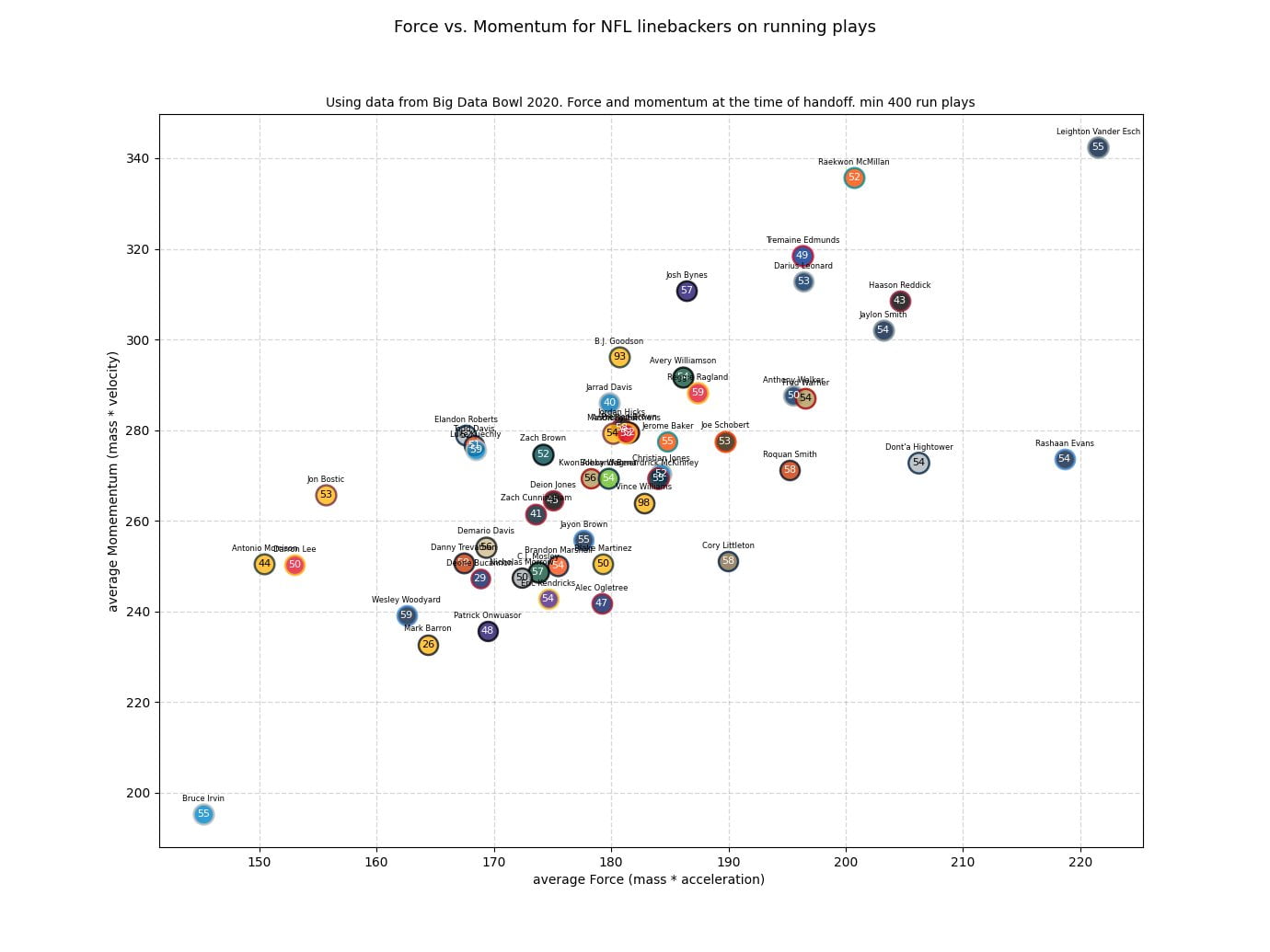 Az átlagos erőt a tömeg és a gyorsulás szorzataként kapta meg, az átlagos lendületet pedig a tömeg és a sebesség szorzataként. A jobb felső sarokban található, tehát a legjobb ilyen mutatóval rendelkezik a Cowboys linebackere, Leighton Vander Esch (és egyébként csapattársa, Jaylon Smith sem marad el sokkal tőle). Vele lehet tehát a legrosszabb találkozni egy futójáték során, mert nagy sebességgel érkezik majd meg a labdacipelőre és nagyot is fog ütni.