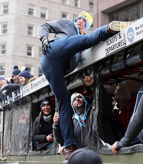 Természetesen a kis közjáték ellenére is hatalmas volt az öröm a New Englandnél. Nem volt kérdés, hogy mindezt alaposan megünnepli majd a klasszis TE, de nem csak egyszerűen a barátaival, hanem egész Bostonnal. A tőle megszokott módon kicsit sem fogta vissza magát a város előtt (bár talán némi visszafogottság nem ártott volna a kamerák előtt): sörözött, ujjongott és bemutatta kiváló táncmozdulatait az embertömegeknek a nagy parádés busz tetejéről. Ezután pedig élvezhette a pár hetes pihenést, amit a holtszezon hozott magával.