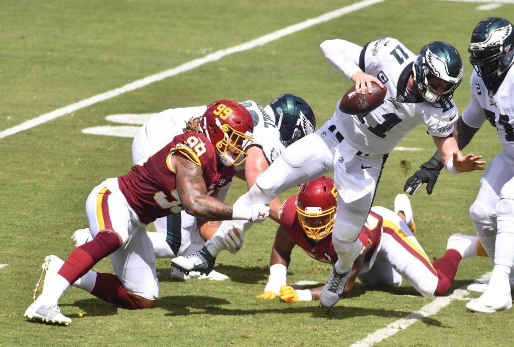 Persze azt is ki kell emelni, hogy a Washington védőfala átvette az uralmat az Eagles megfogyatkozott támadófala felett és ott verték meg a nullkilométeres játékosokat, ahol csak akarták. A Sasoknál Nate Herbig és Jack Driscoll kezdett RG és RT poszton, összesen 3 profi snappel rendelkeztek eddig, majd a meccs folyamán a rögbis Jordan Mailatának is be kellett állnia a falba. Chase Youngék pedig simán dominálták ezt a matchupot és megfojtották az Eagles támadásait – Young 1,5 sackkel mutatkozott be, Kerrigan 2-t, Ionnidis még 1,5-öt, Bostic és Sweat 1-1, Jonathan Allen és Daron Payne pedig fél-fél zsákolást gyűjtött össze.