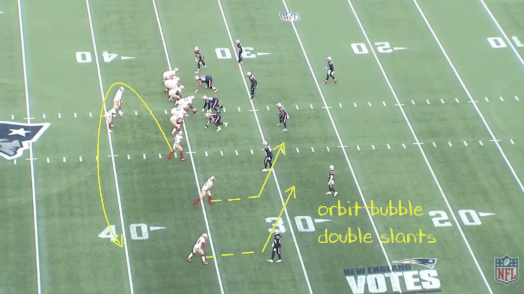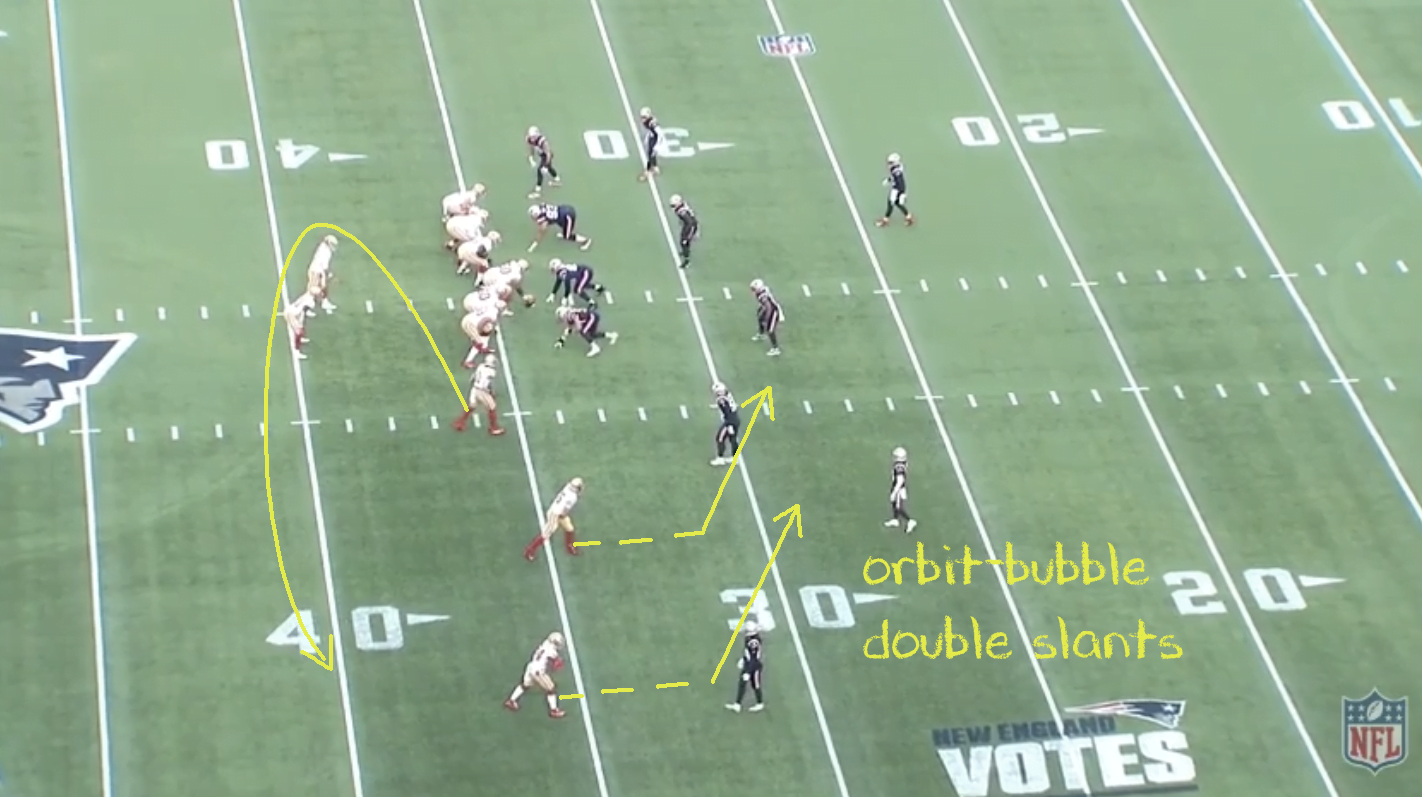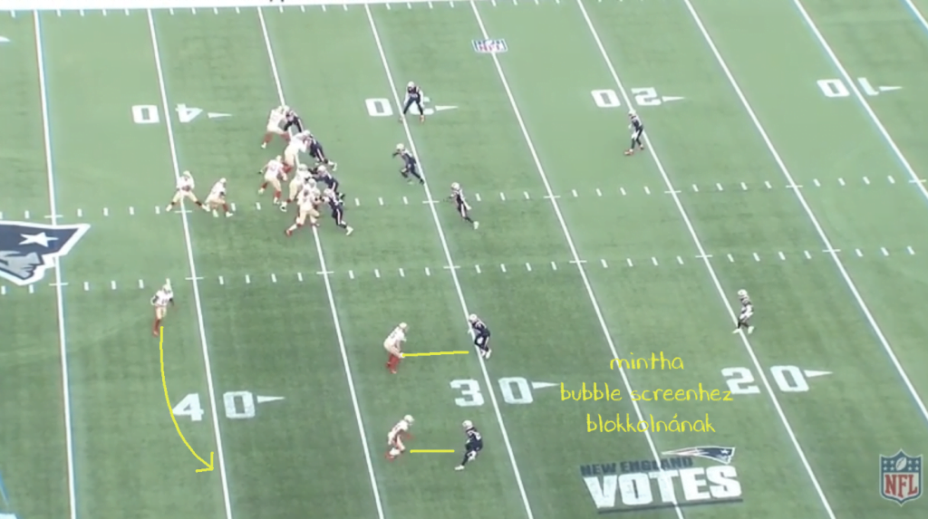 A játék alapvetően egy bubble screenek néz ki, Aiyuk megkerüli az irányítót és jön a jobb oldalra, várva a screent. Kittle és a szélen Bourne is úgy indul el, mintha blokkolnának, eladva a védők számára, hogy itt tényleg egy bubble screen lesz.