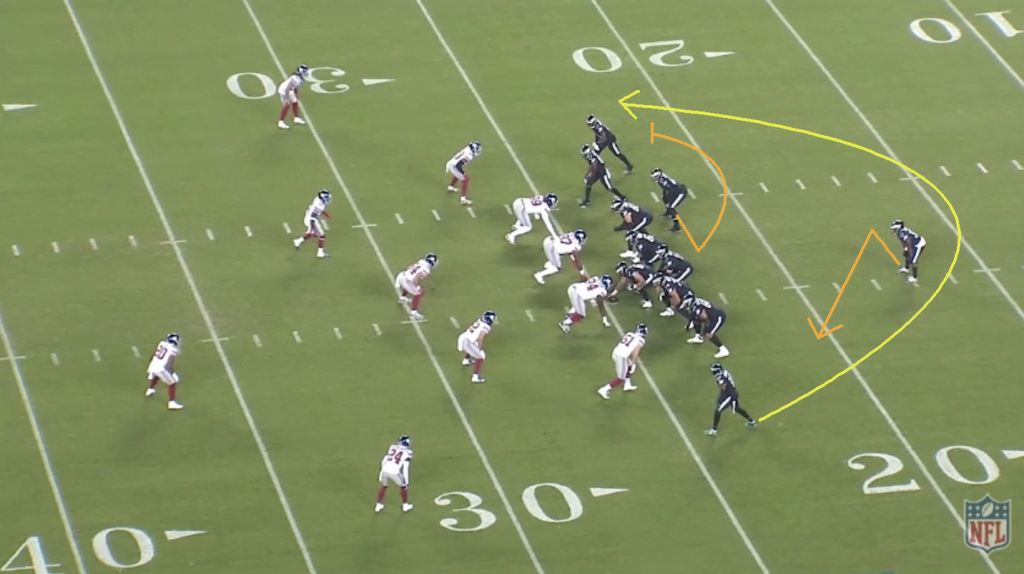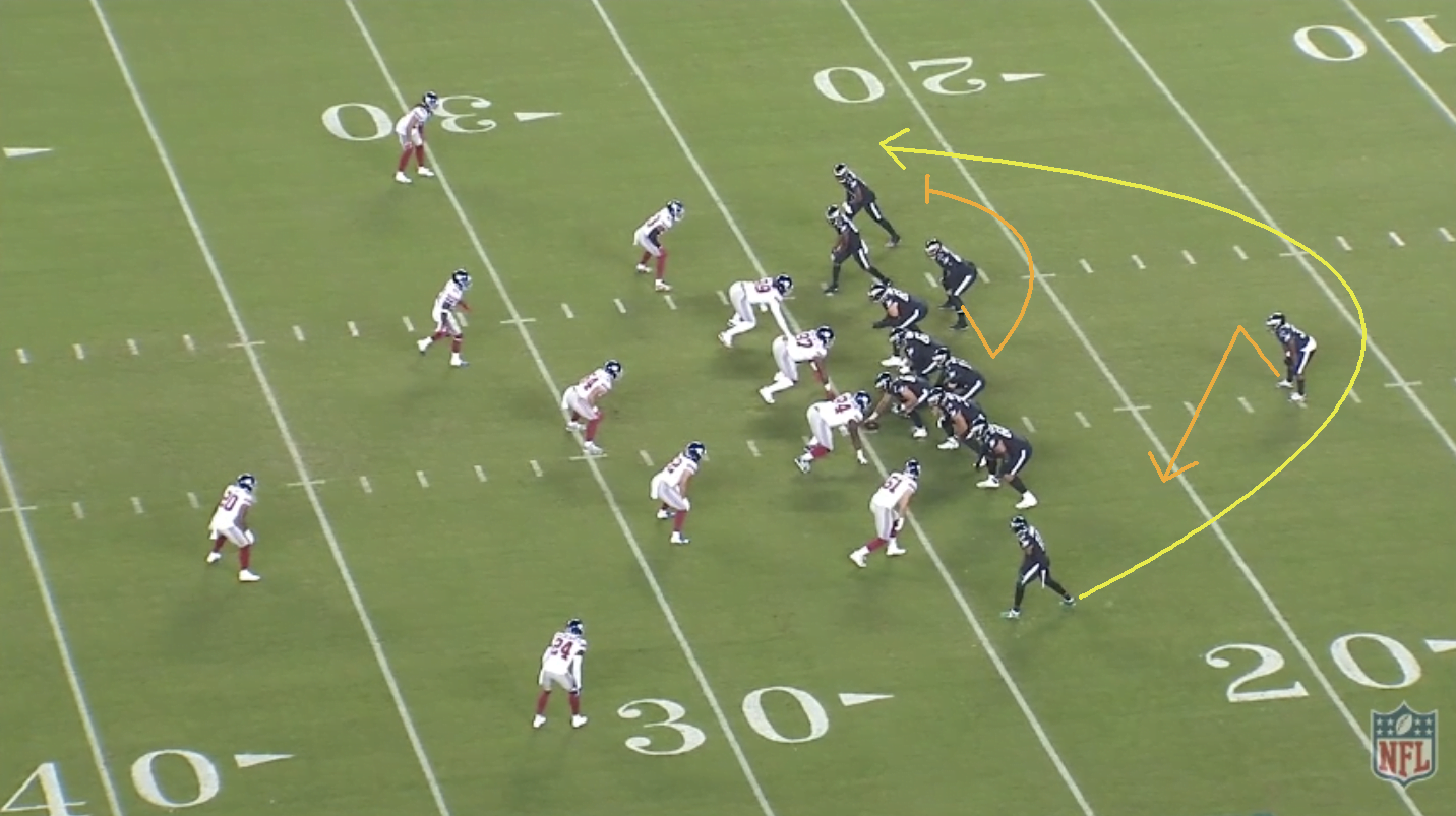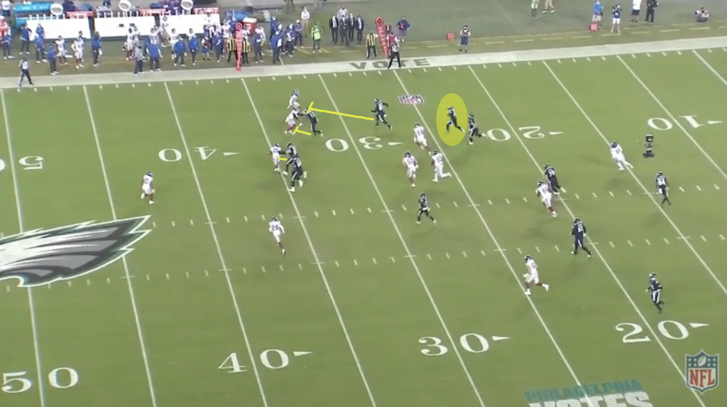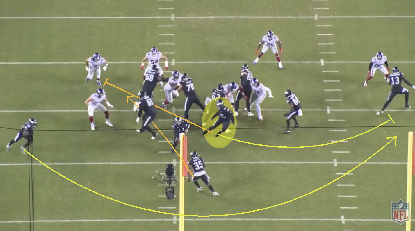 Narancssárgával jelöltem alább, hogy a counter esetén hogy nézne ki a játék. A tight end (Richard Rodgers) blokkolná a lyukba igyekvő védőt, a futó (Boston Scott) pedig a húzó guard és a tight end között megtalálná a rést és elfutna, ameddig tud. Most viszont nem ez történik, Rodgers megfordul, Scott nem kapja a labdát, Jackson viszont igen, így a jobb oldalra fog menni a játék.