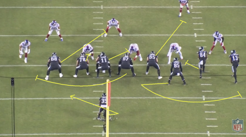 Összességében egyébként így nézne ki felrajzolva a játék, orbit motionös bubble screen és double slants, csak ez utóbbiaknál pár lépés “színészkedés” is benne van a dologban.