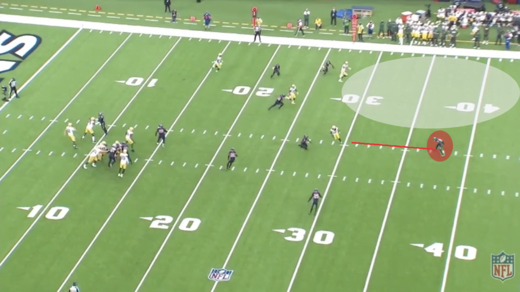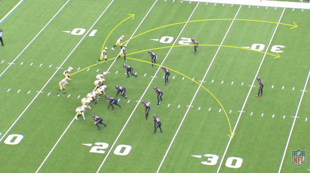 Alapjában véve ez egy verticals játék, az alapelvei hasonlók, csak kicsit meg van fűszerezve. Leginkább azzal, hogy az egyik vertikális útvonalat a running back futja, ezt pedig általában nehéz levédekezniük a defense-eknek. Másrészt azzal, hogy van egy checkdown opció a szélen, ami legtöbbször jet motionből jön a túloldalról, de most épp nem így van, hanem Jamaal Williams megy ki a flatbe. Tonyan futja a szélső vertikális útvonalat, Dillon megy a seambe (általában Aaron Jonesé ez az útvonal), a keresztező route-ot pedig Adams futja jelen esetben. Ezzel jól megnyújtják a pályát és nehéz helyzetbe hozzák a védőket.