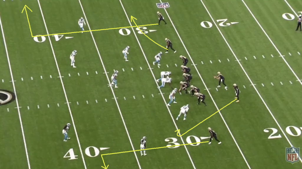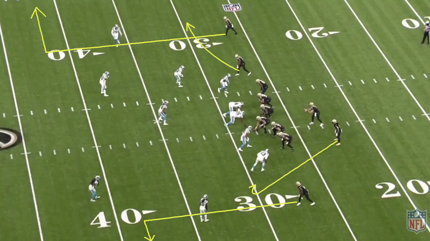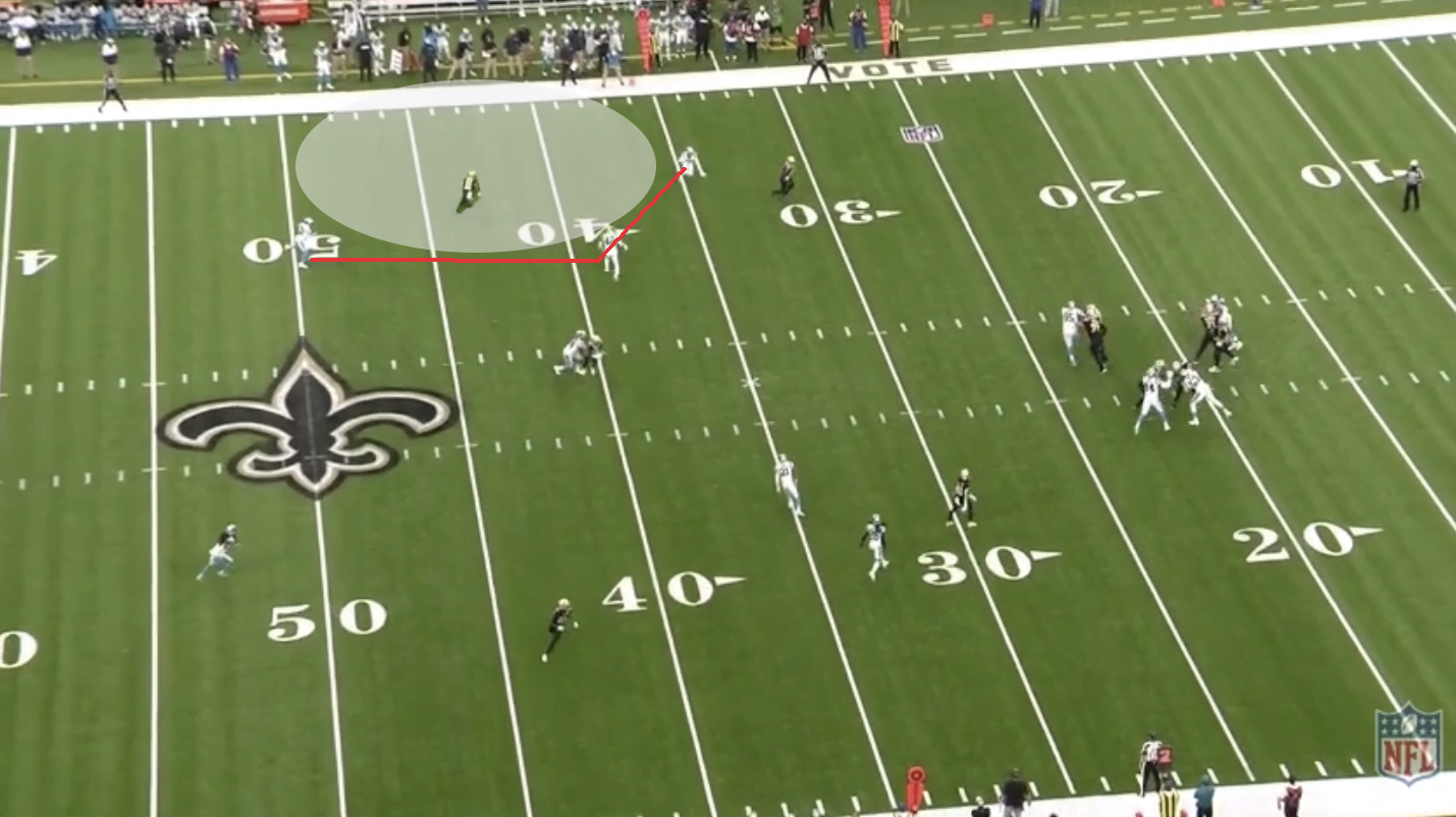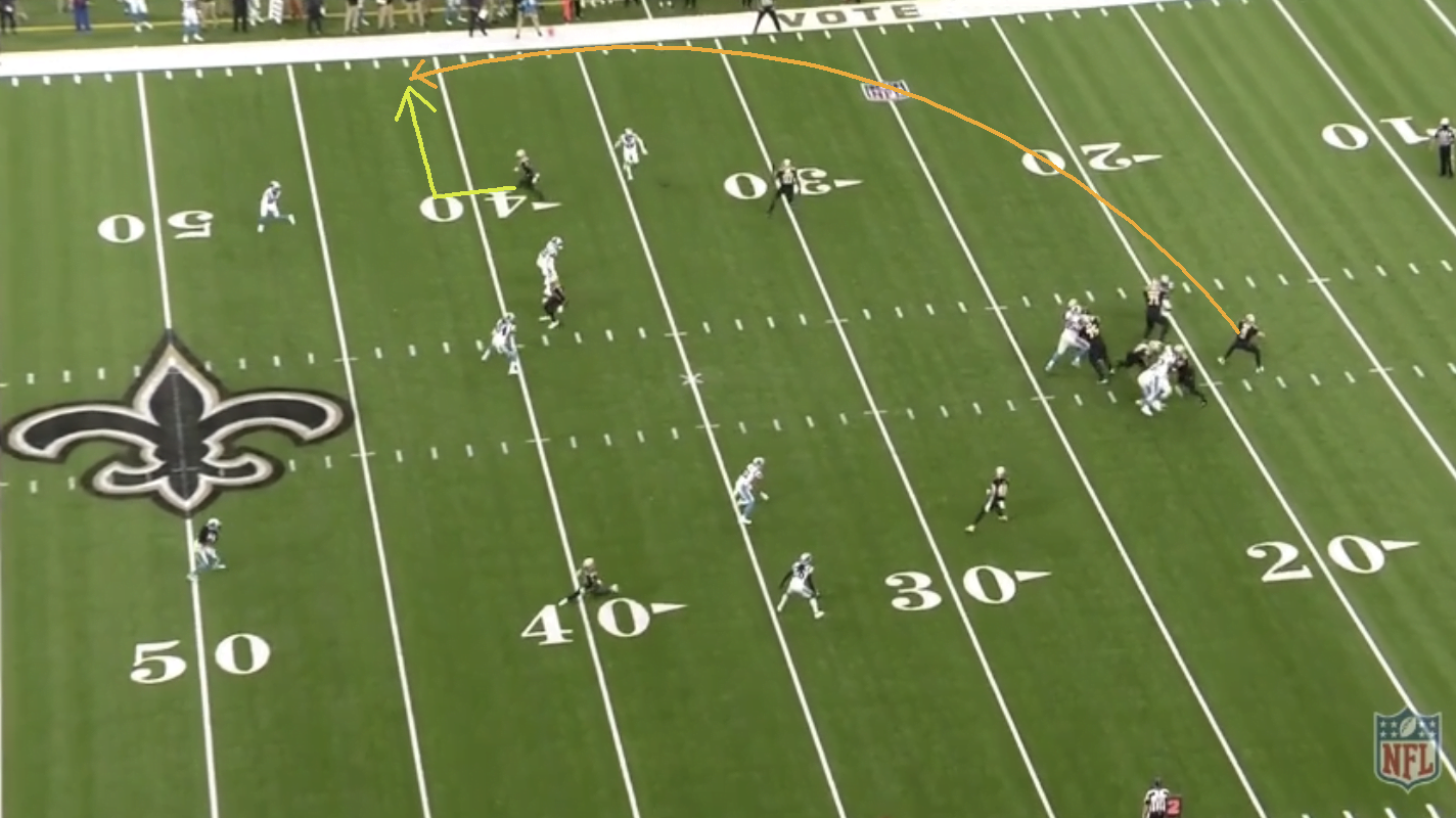 Ennél a játéknál egy deep out passzt fog megdobni Brees közel 20 yardért a túloldali hashmarktól az oldalvonalig. Ez az a dobás, amihez a leginkább kell karerő az NFL-ben, hiszen nagy távolságot kell utaznia a labdának és könnyen odaérhet a védő, ha nem tudod elég erősen megdobni. Vagy ha nem tudod több lépéssel előre, mi fog történni.