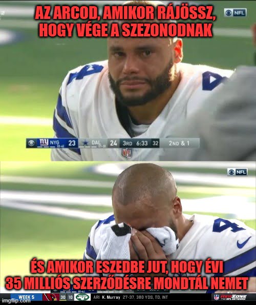 Nem látok bele mást mint ami: Dak arca a brutális sérülése után. Joe Theismannak a karrierjébe került egy hasonló sérülés, Alex Smith egy ponton az életéért küzdött, Prescott talán megússza komplikációk nélkül. A lényeg hogy a szurkoló nem örül akármelyik játékos sérülésének, ugyanúgy szerintem a sérüléskor készült képekkel sem ildomos mémet gyártani. Nem akarok levetetni és hasonlók, csak annyit javasolnék, hogy inkább használj semleges képeket, ne olyat amin a szereplő egyértelműen fizikailag és lelkileg is rottyon van.