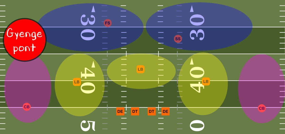 Alább látszik, hogyan is néz ki egy cover 2 pontosan. Külön berajzoltam a formáció gyenge pontját, ami a safety – szélső CB – oldalvonal közti területen helyezkedik el. Ez az egyik legnehezebb dobás a futballpályán, hiszen a szélre, kis területre kell bedobni a labdát – ezt nevezik “hole shotnak” egyébként. Nyilván nem megoldhatatlan, sőt, NFL-szintű irányítóktól azért elvárás, de nem egyszerű. Főleg nem úgy, amilyen helyzetben volt Fitzpatrick a dobás pillanatában.