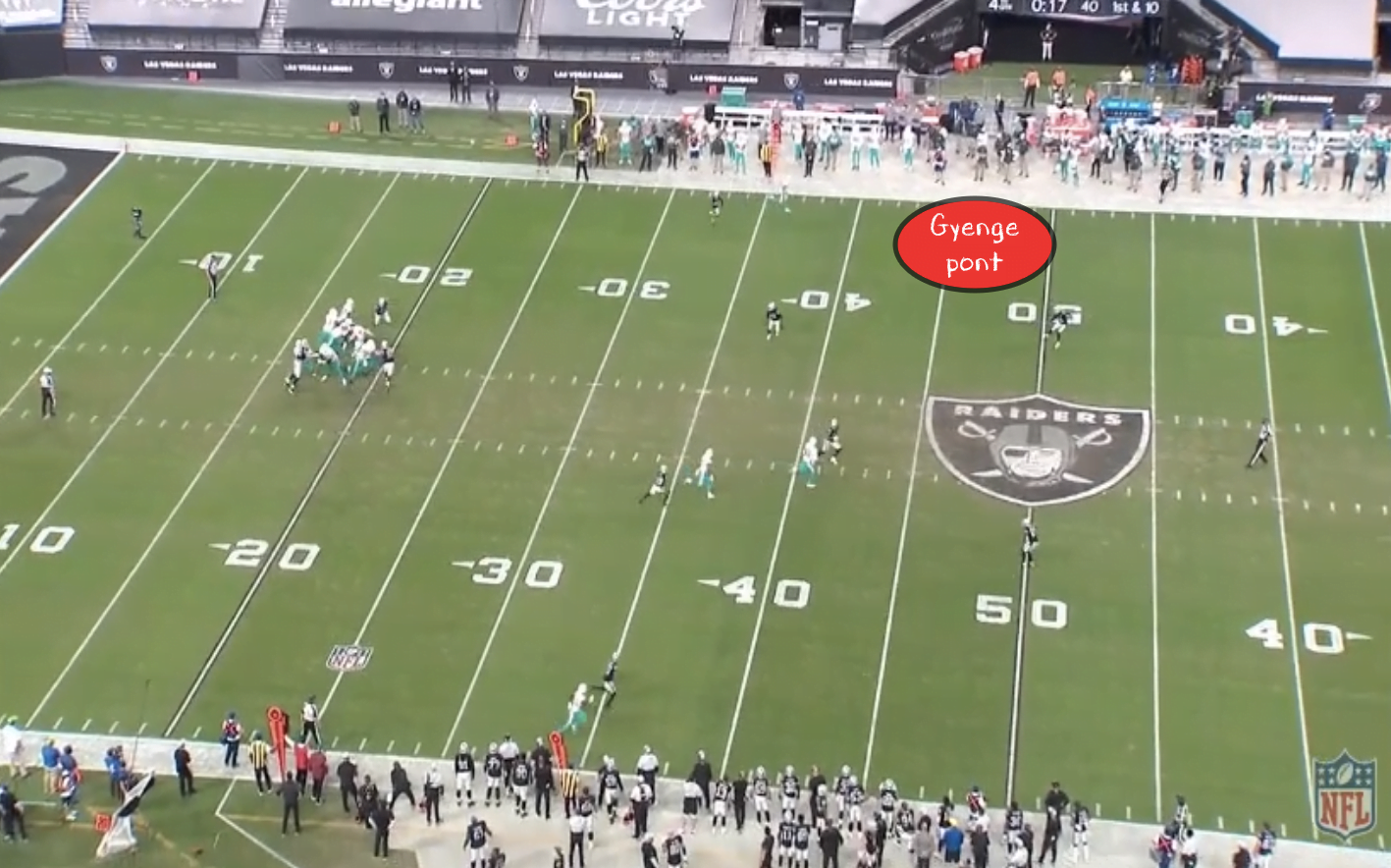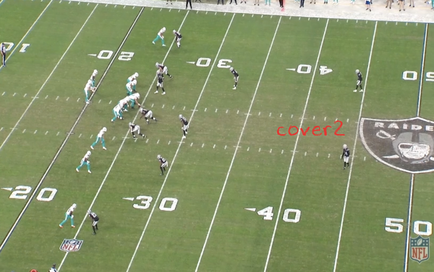 Az már a snap előtt látszik, hogy cover2 a hívás a Raiders részéről. Két safety hátul mélyen, alatta zónázás. A szélső CB-k felállása alapján gondolhatnánk 2-Man hívásra is, de belül látszik, hogy minden bizonnyal zónázás lesz.