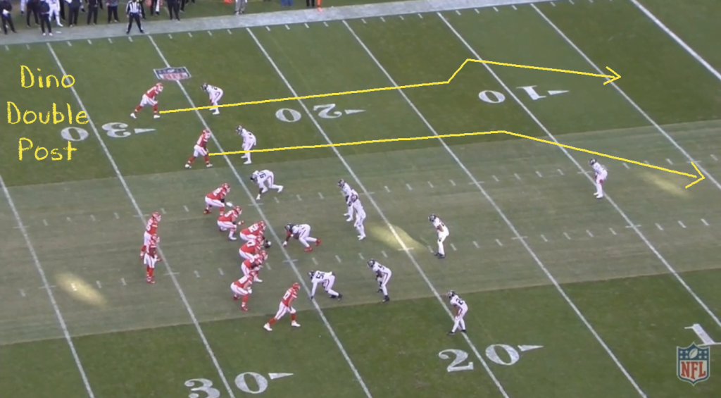 Egy double post játékról van szó, tehát a bal oldalról ketten is post útvonalat futnak. Illetve egyik sem igazi post, mert a slotból Hillé inkább egy deep crosser, a szélen Robinsoné pedig egy úgynevezett Dino route, azaz egy post-corner-post, ahol elhiteti, hogy cornert fut, ám végül mégis bevág postra.