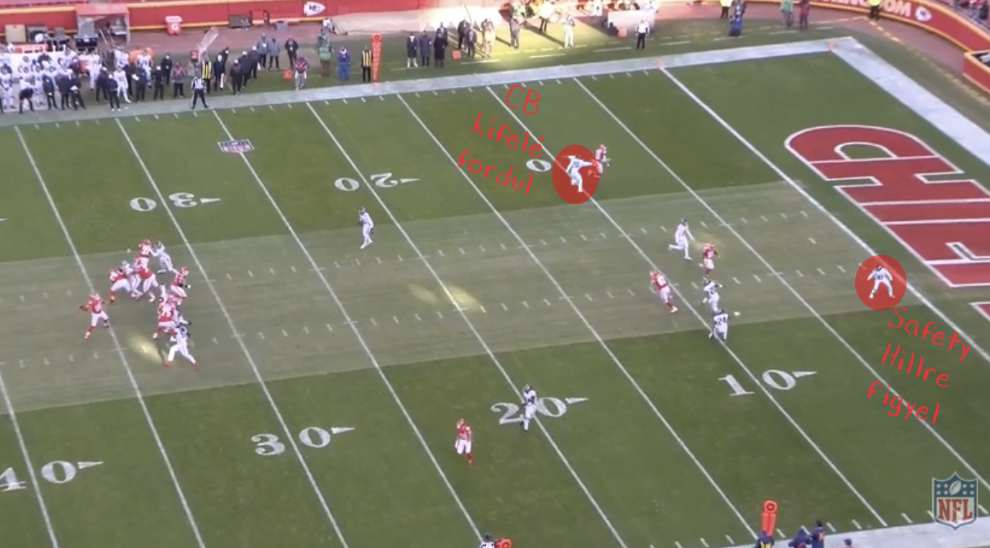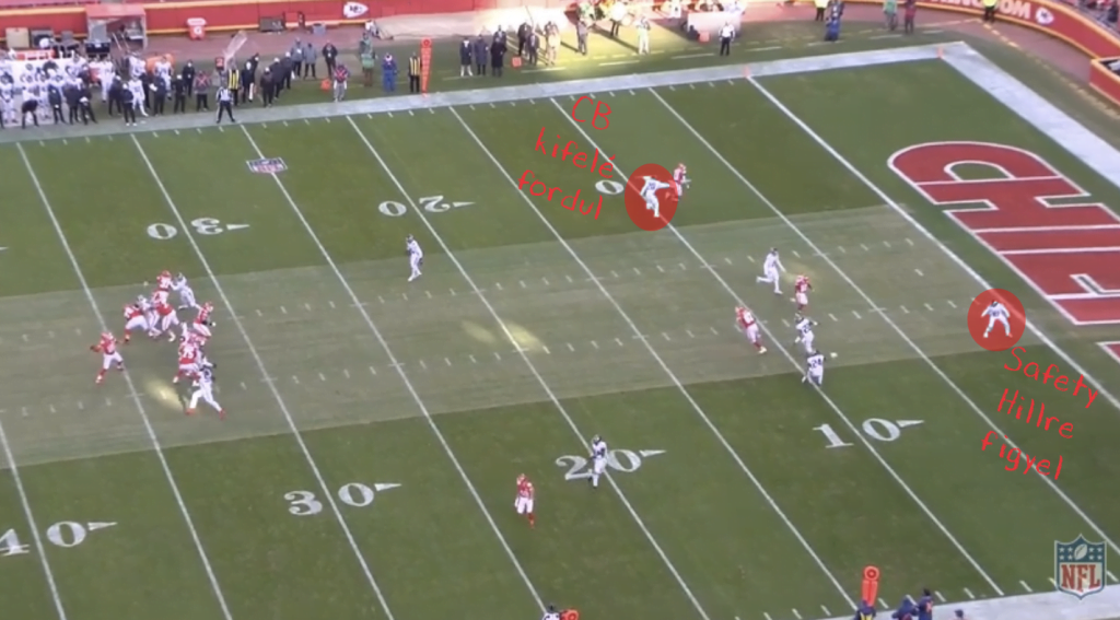 Az első opció elméletben a slotból induló post, ám legtöbbször nem ez lesz üresen. Egyrészt azért, mert Hillről van szó, aki egyébként is extra figyelmet érdemel (épp ezért vele játszatják ezt a szerepet), másrészt mert ő megy előbb a single high safety környékére, így a védő rá fog figyelni és elmozog jelen esetben a támadók szerinti jobb oldalra. Látható is, hogy mennyire “tiszteli” a safety Hillt, így Mahomesnak esélye sem lenne odadobni a labdát. Ami nem is baj, mert a játék úgy van kitalálva, hogy a második opció üresen maradjon.