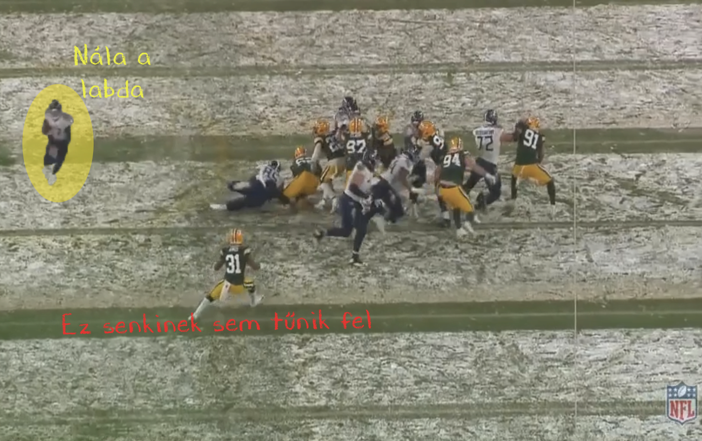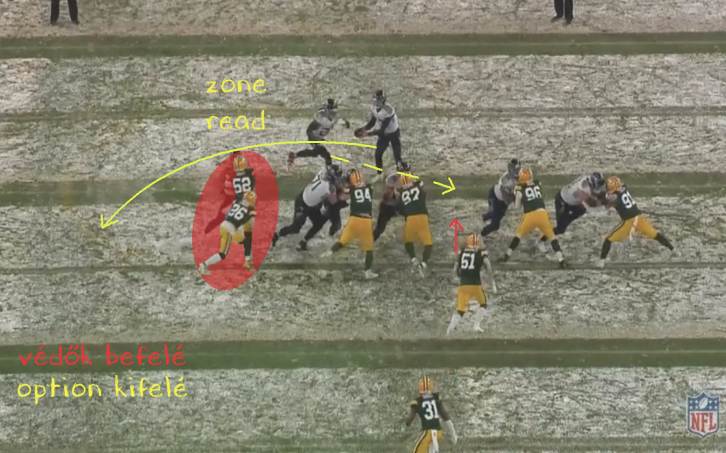 A Titans tehát zone readet hívott, azaz Tannehill a támadók felőli jobb szélső védő mozgása alapján döntött, hogy megtartja a labdát vagy átadja Henrynek. A Packers nickel blitzet hívott, így Rashan Gary egyből befelé lépett és ezáltal a safety Darnell Savage lett az “olvasott” játékos. Safety lévén ő viszont nem tudja a megfelelő technikákat zone read olvasott emberként, úgyhogy egyből befelé rontott, hogy megpróbálja megállítani a futást.