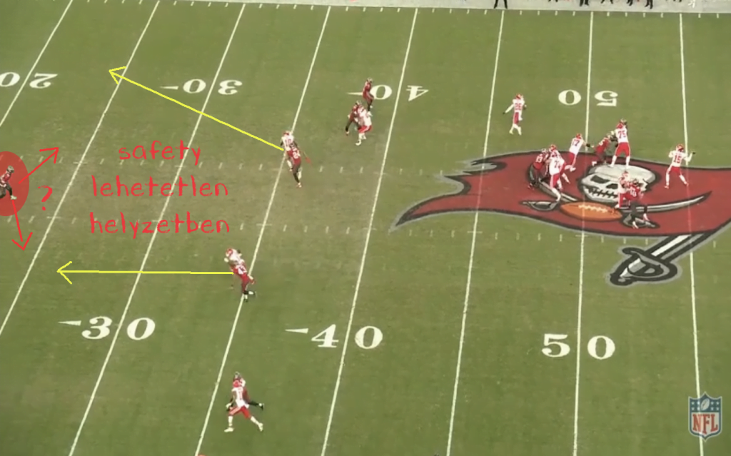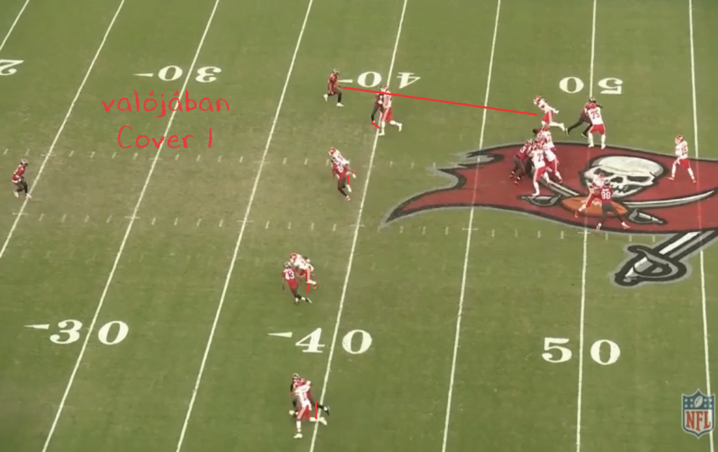 A Buccaneers 2 high safetyt mutat a snap előtt és a cornerek felállásából következtethető, hogy emberezés van, tehát látszólag 2-man a hívás.