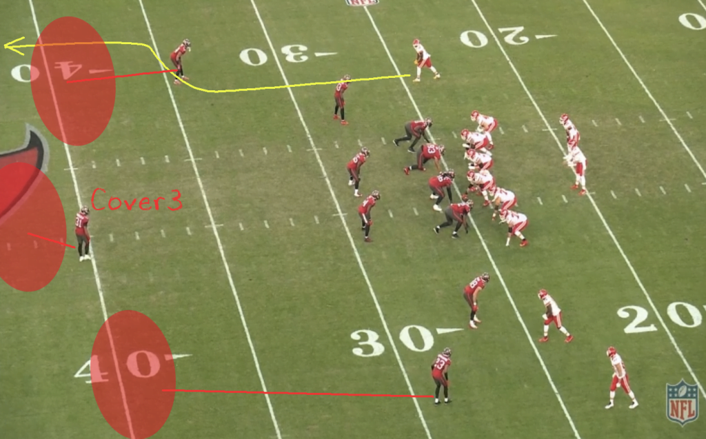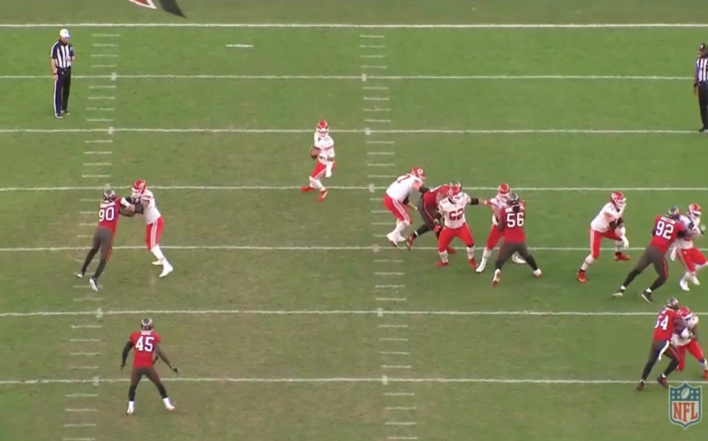 A legtöbb csapat ugyebár 2-high safetyvel védekezik a Chiefs ellen, félve a mély passzoktól (jogosan), így idén kevesebb olyan találkozót láttunk, ahol ennyire be tudott volna indulni a Kansas City támadósora. Persze gondot ez sem okozott, ha a mélyet elvette a védelem, akkor rövid és középtávoli játékokkal oldották meg a helyzeteket. A Buccaneers viszont agresszíven kezdte a találkozót, sok single high safety felállást választott és sokat emberezett. Erre pedig alaposan ráfázott.