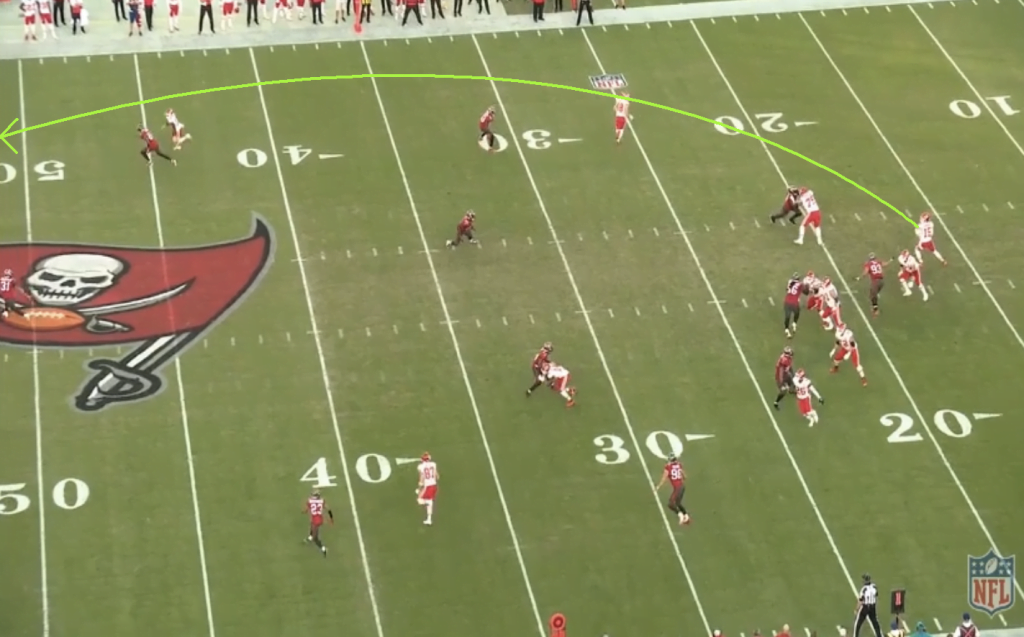 Már itt látja Mahomes, hogy Robinson mindenképp tök üresen lesz, de mivel Hill lendületből érkezik, könnyedén lefutja Murphy-Buntingot, így neki passzolva még több yardot lehet szerezni. És pontosan ez is történik, Mahomes már elég hamar elindítja a labdát, ami pontosan Hill kezébe érkezik az oldalvonalnál.