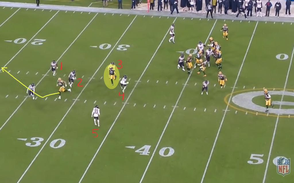 A Packersnél igazából két downfield útvonal van csak ennél a playnél, plusz két checkdown opció. Adams egy over útvonalat fut, Tonyan pedig egy corner-postot, azaz elhiteti a cornert egy pillanatra, de aztán bevág középre egy postra.