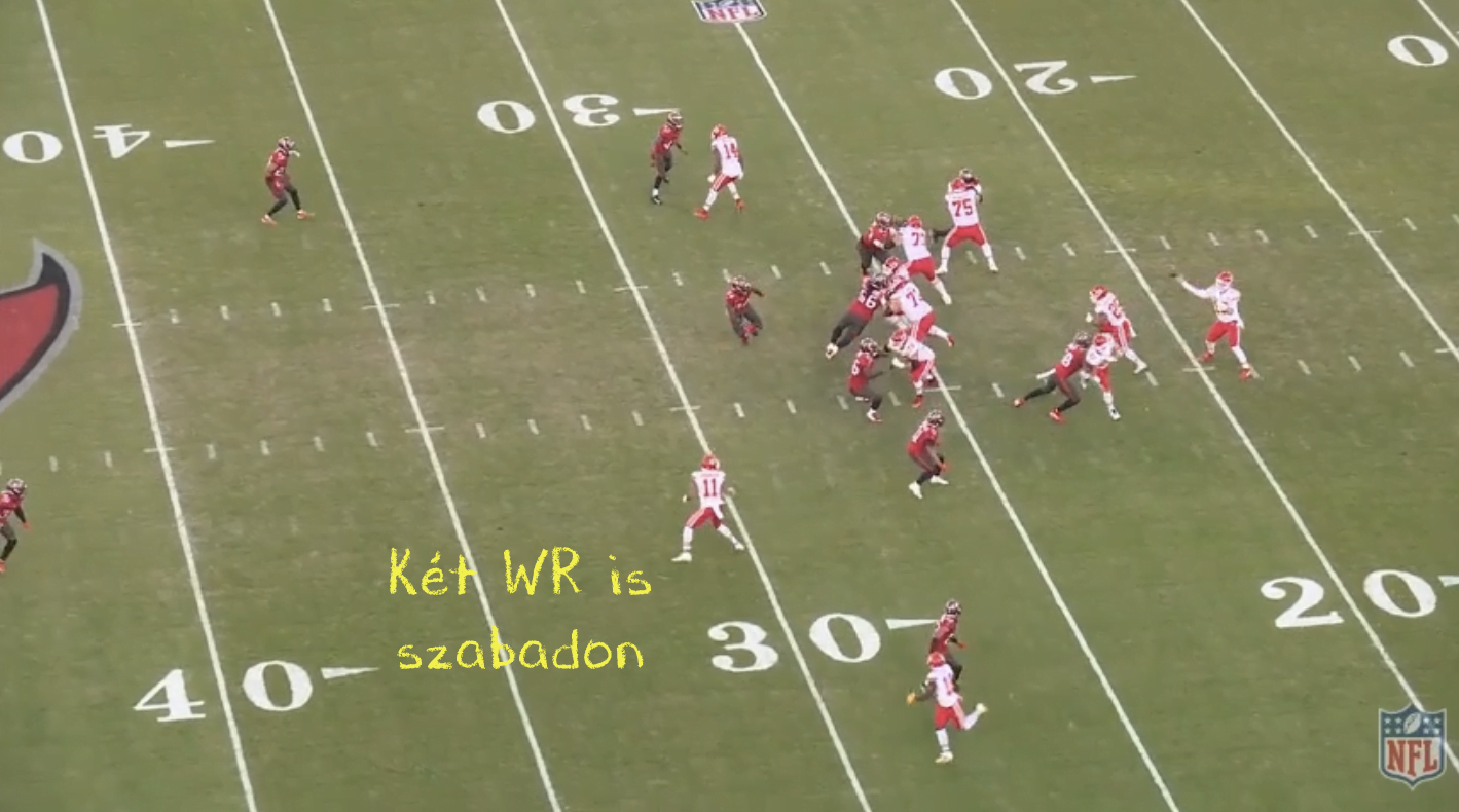 Hill egy out-and-go double-move-ot fut. A Buccaneers pedig Cover3-at védekezik, tehát három mélységi védő van, alul pedig zónázás. Viszont ha a szélen egy vertikális útvonal van, akkor természetesen a szélső CB-nek fel kell vennie az elkapót és egy az egyben kell levédekeznie a mély route-ot. Így jár Carlton Davis is, mennie kellene Hillel, de hát az nem olyan egyszerű feladat.