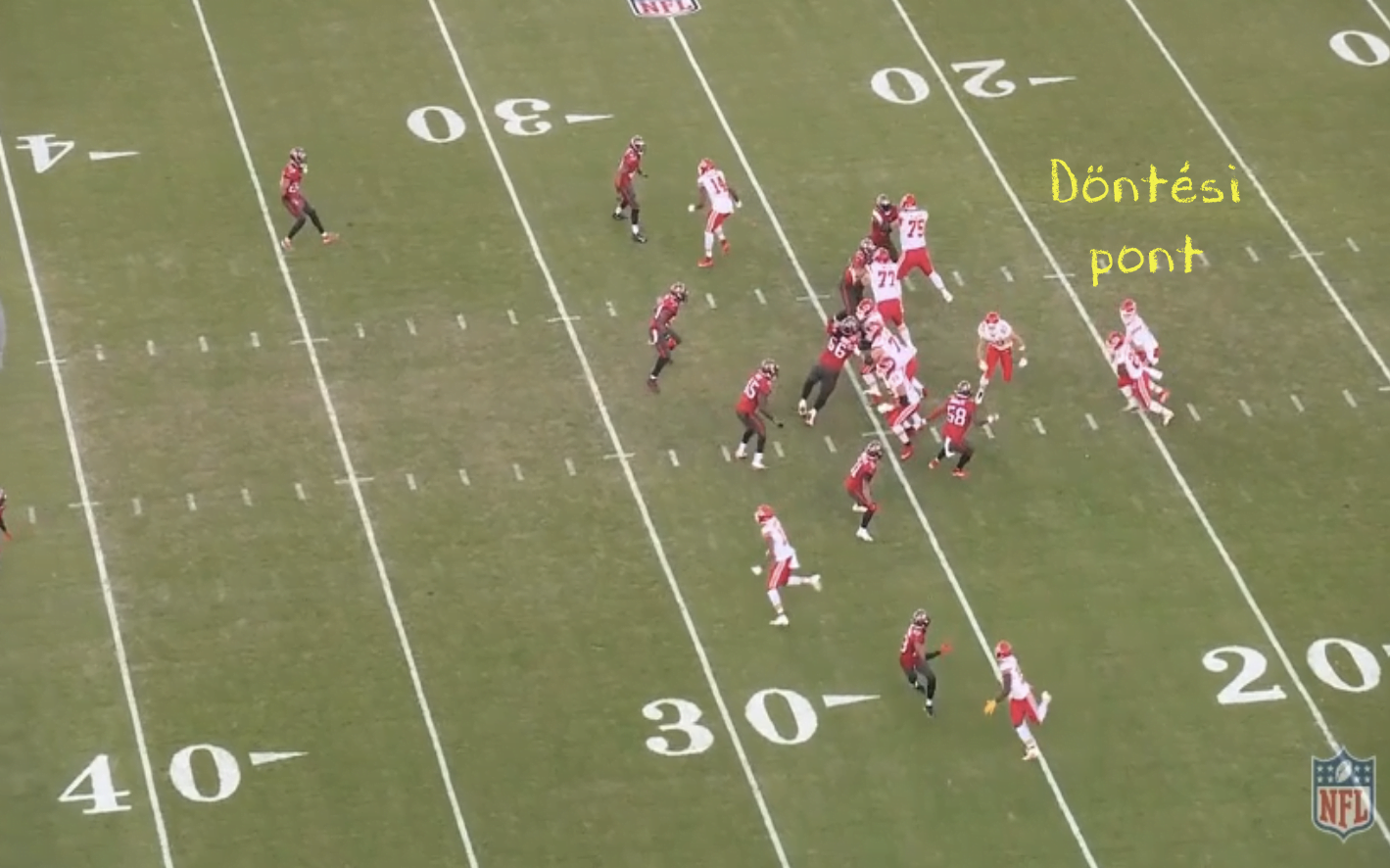 Indul a játék, a fal elkezd futáshoz blokkolni, a handoff pillanatában pedig döntenie kell Mahomesnak. Ez látszik az alábbi képen. Mivel a linebackerek felléptek (itt elsősorban a Robinson útvonalának helyén lévő LB a fontos, őt olvassa Mahomes), így az irányító megtartja és passzolni fog.