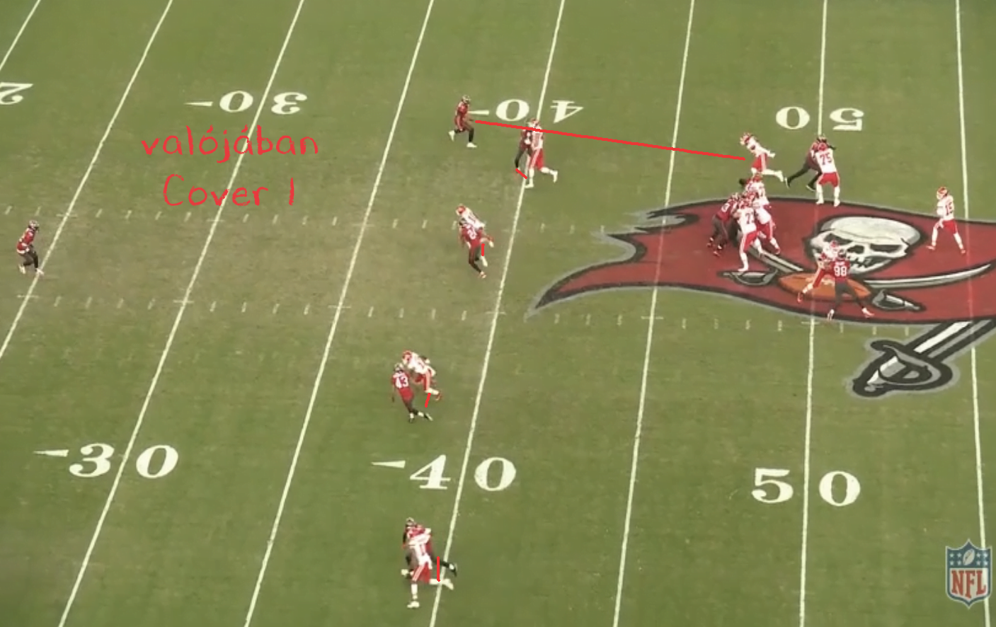 A Buccaneers 2 high safetyt mutat a snap előtt és a cornerek felállásából következtethető, hogy emberezés van, tehát látszólag 2-man a hívás.