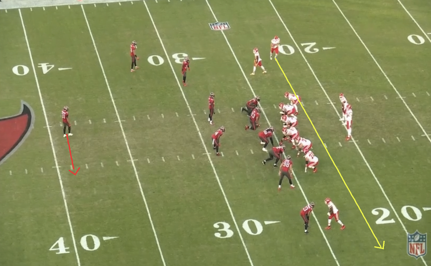 A snap előtt Kelce a támadók szerinti jobb szélről átmozog a bal oldalra, ezzel pedig a single high safetyt is egy kicsit átmozgatja abba az irányba, ezáltal Hillnek több helye lesz a jobb oldalon.