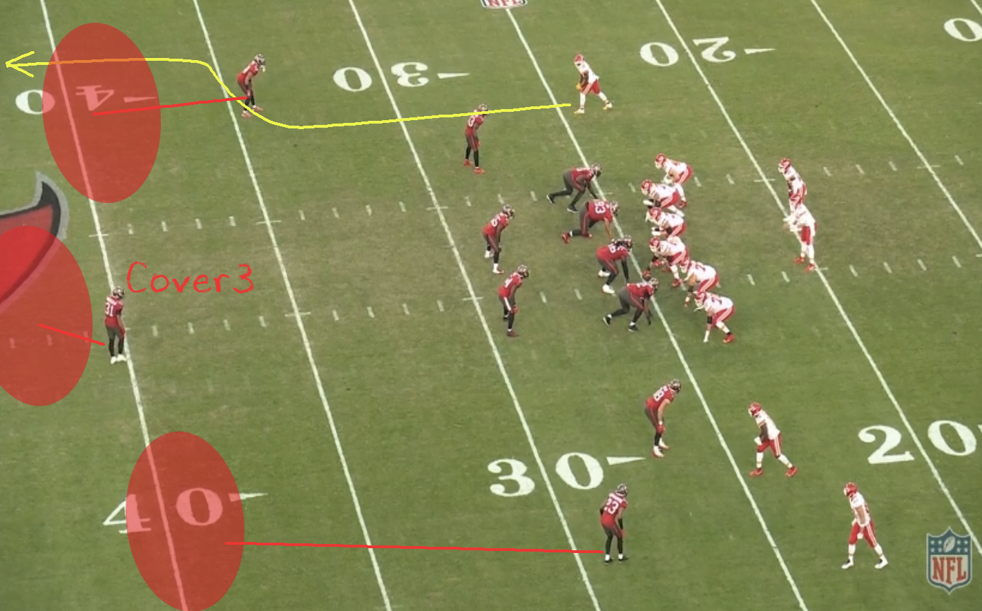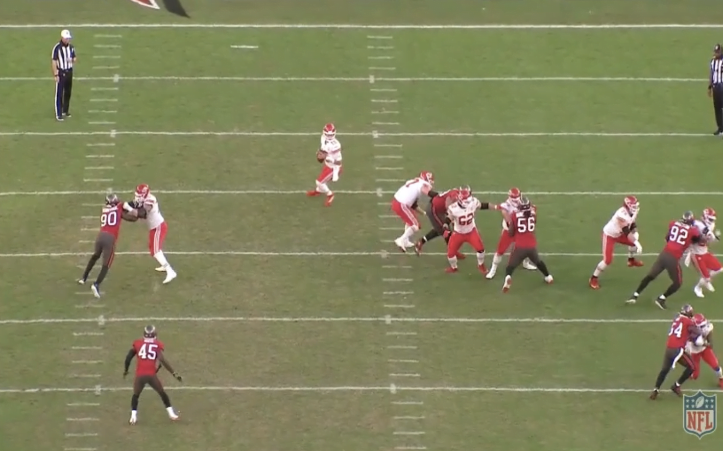 A legtöbb csapat ugyebár 2-high safetyvel védekezik a Chiefs ellen, félve a mély passzoktól (jogosan), így idén kevesebb olyan találkozót láttunk, ahol ennyire be tudott volna indulni a Kansas City támadósora. Persze gondot ez sem okozott, ha a mélyet elvette a védelem, akkor rövid és középtávoli játékokkal oldották meg a helyzeteket. A Buccaneers viszont agresszíven kezdte a találkozót, sok single high safety felállást választott és sokat emberezett. Erre pedig alaposan ráfázott.