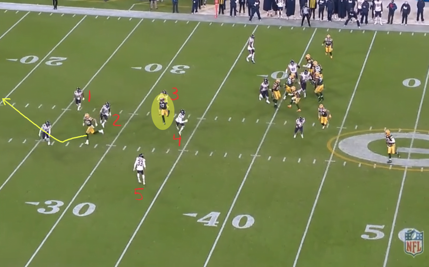 A Bears védelme zónázik, és a két útvonalra vannak hatan, mégsem sikerül megoldani a helyzetet. Igazából a 2-3-4-5-ös játékosok jól végzik a dolgukat, hiszen jó pozícióban vannak a feladatuknak megfelelően (a 3-as követi a zónájából épp kilépő Adamst, a 2-es felveszi, az 5-ös pedig várja, ha tovább érne). Azt nem tudom, hogy az 1-es számmal jelölt Kyle Fuller mit csinál, miért lép be és fel ennyire, így ugyanis Tonyan simán belép a két safety közé és mögé, aztán meg könnyű TD-t szerez.