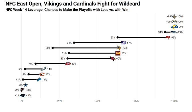 Ezek alapján öt csapatnak is hatalmas jelentőségű a hétvége, hiszen egy győzelemmel nagyon jó helyzetbe kerülnének, egy vereséggel viszont nagy bajban is lehetnek. A Colts-Raiders összecsapás bír a legnagyobb téttel a héten, hiszen mindkét gárdának közel 40% különbséget jelent a kimenetel a rájátszás elérésének esélye szempontjából. Önmagában pedig a Ravensnek a legfontosabb a győzelem, hiszen 48 százaléknyi különbséget jelent az esélyeket illetően, hogy hétfő éjjel legyőzik-e a Brownst. Az öt csapatból a Titansnek lesz a legkönnyebb dolga, ugyanis csak az 1/2-es Jaguarst kellene megverni, hogy szinte biztos legyen a playoff részvételük – egy meglepetés vereséggel viszont nagy bajba kerülhetnének. A legnehezebb dolga pedig a Dolphinsnak lesz, hiszen a bajnok Chiefs ellen kell pályára lépniük – egy vereséggel már valószínűbb lenne, hogy a Miami lemarad a playoffról.