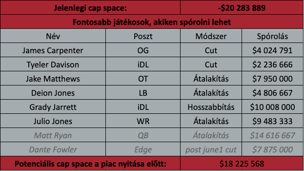 Ha új irányítót akar draftolni idén a Falcons, akkor nyilván nem szabad Ryan szerződéséhez hozzányúlni, mert jövőre jelen állapotok szerint $15 milliót lehet spórolni az elcserélésével. Ha viszont nem akarnak most draftolni, vagy jövőre továbbállni, akkor nyugodtan lehet babrálni a kontraktussal és akár $14,6 milliót is lehet spórolni az idei évre. Én ezzel most nem számoltam a fenti táblázatban, de az sem lenne meglepő, ha ezt megtennék – akkor viszont egyértelművé teszik mindenki számára, hogy nem érkezik irányító az 1/4-es pickkel.