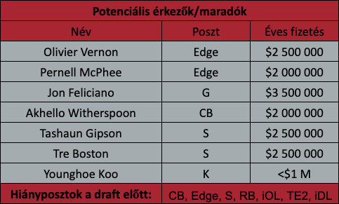 Hiányposzt így van bőven. Konkrétan a teljes secondaryből egyedül a tavaly draftol AJ Terrellnek, illetve Isaiah Olivernek van szerződése, így ide mindenképp kell még egy CB és két safety. Fowler kivágása esetén edge rushere sem lenne a csapatnak a rosteren, tehát nyilván ez is hiányposzt. Ilyen a futó is, habár erre nem áldoznék pénzt ilyen szűk erőforrásokból, így az maradjon a draftra. A belső támadófalba is kell még egy ember legalább, Carpenter kivágása után konkrétan itt sincsenek meg darabszámra a kezdők. A belső védőfalat sem ártana mélyíteni és egy második számú tight end is elférne, de az már csak hab lenne a tortán.