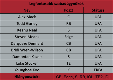 Alex Mack távozására már felkészült a csapat Matt Hennessy tavalyi draftolásával, így várhatóan ő nem tér vissza. Todd Gurley-ért egyáltalán nem kár, semmit nem ad hozzá a játékhoz. Steven Means nem nyújt túl sokat, de mélységnek jó lehet, tavaly is egy 1 milliós szerződést írt alá a csapattal, ezt meg lehet ismételni akár most is. A nagy falat viszont a secondary lesz, ahol négy játékos szerződése is lejár: Darqueze Dennard és Bridi Wleh-Wilson a cornerek közül, Keanu Neal és Damontae Kazee a safety sorból távozik jelen állás szerint. Itt ki kell találni, az új stáb kit szeretne megtartani. Meg kell még említeni Younghoe Koo-t, aki kiválóan teljesített tavaly, ERFA tenderrel $1 millió alatt megtartható.